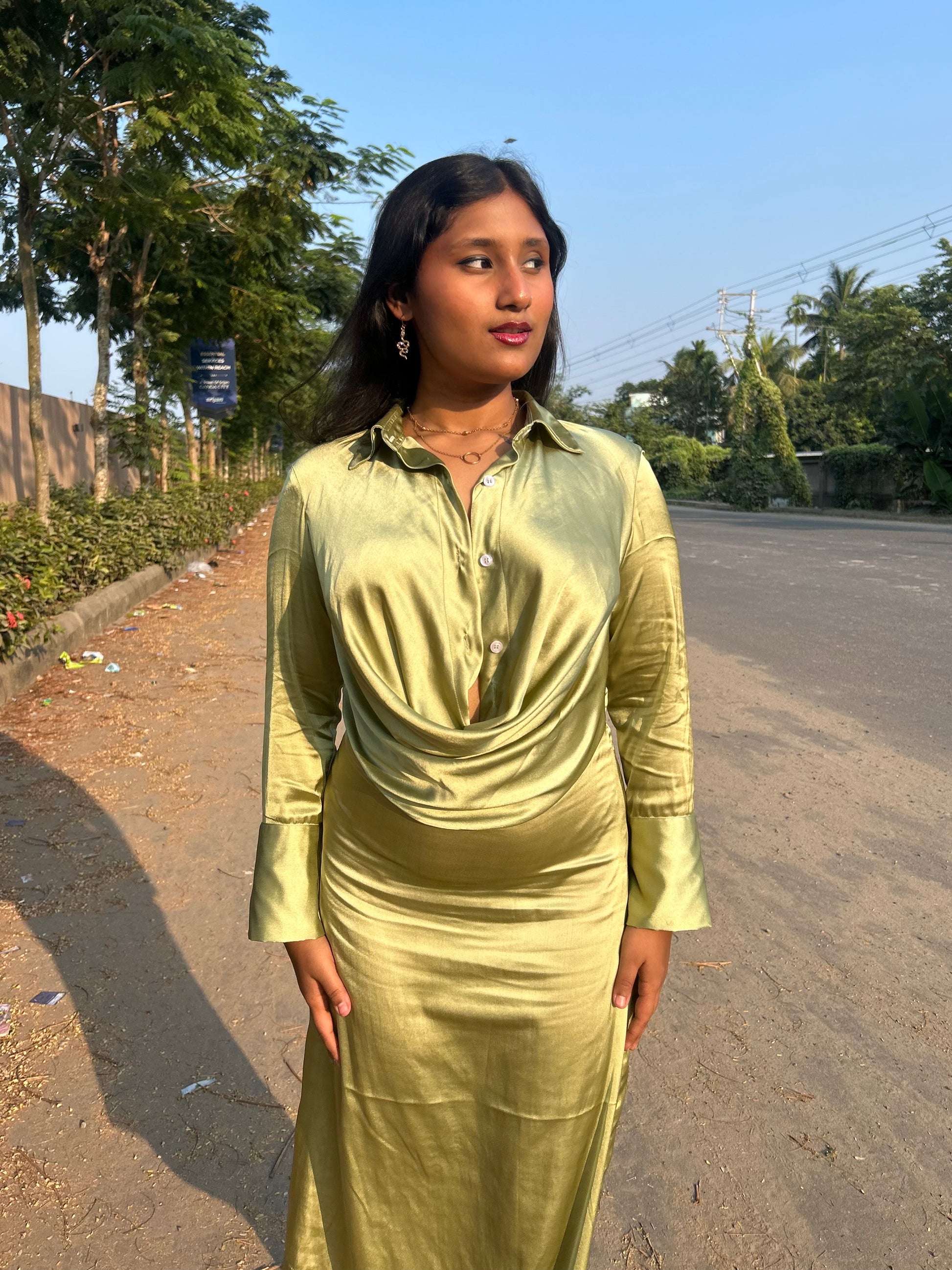 It begins in the soft sheen of sage-green satin calm, luminous, and effortlessly flattering. Draped through the bodice and flowing into a smooth midi silhouette, she moves with quiet elegance.                                                                                                                                  Her secret lies in the gentle cascade front and tailored collar, blending ease with subtle allure.                                                                                                                                    Serene, refined, and beautifully understated. The Rosabella Midi Drape Dress is for women who glow without trying.