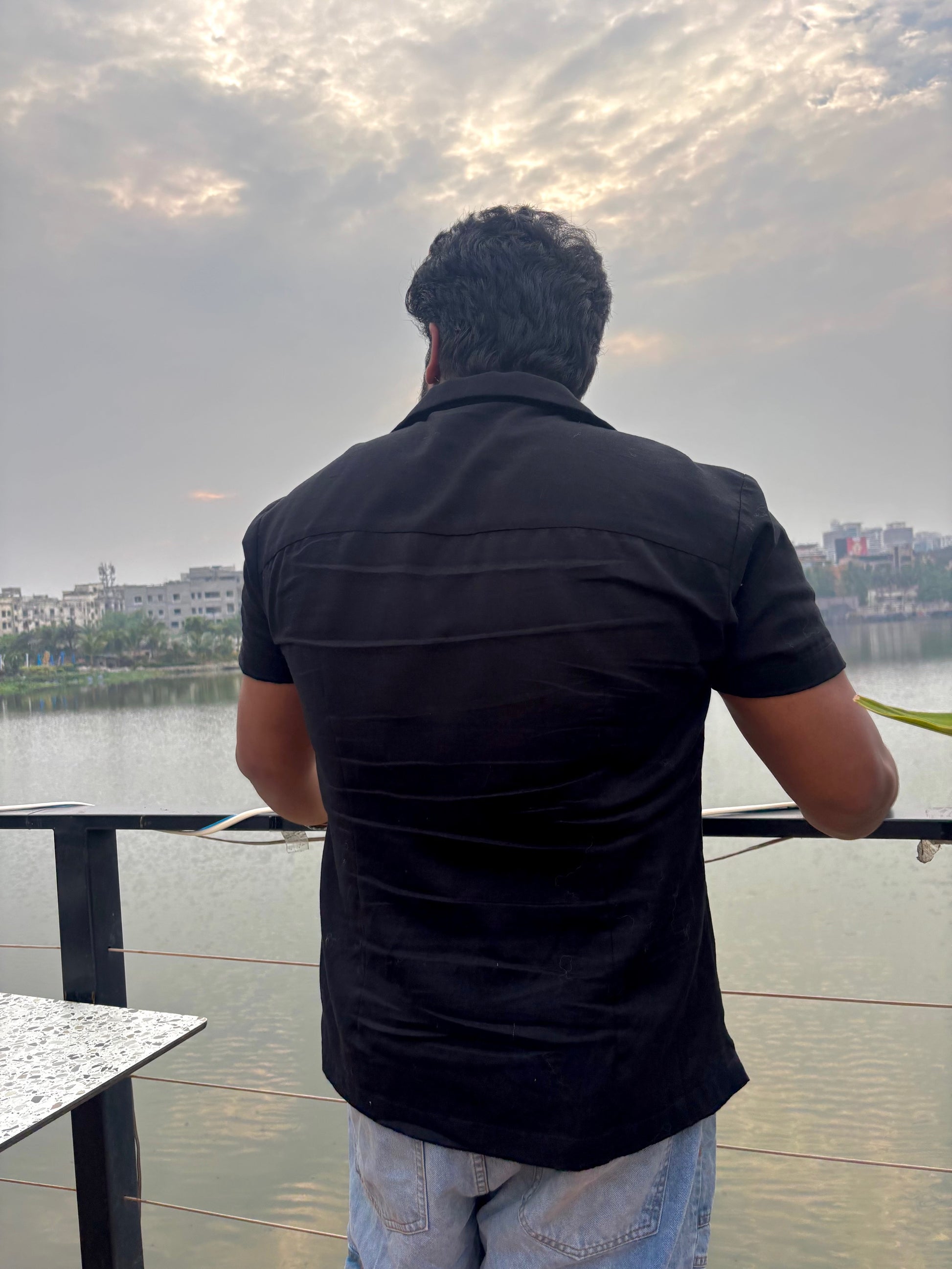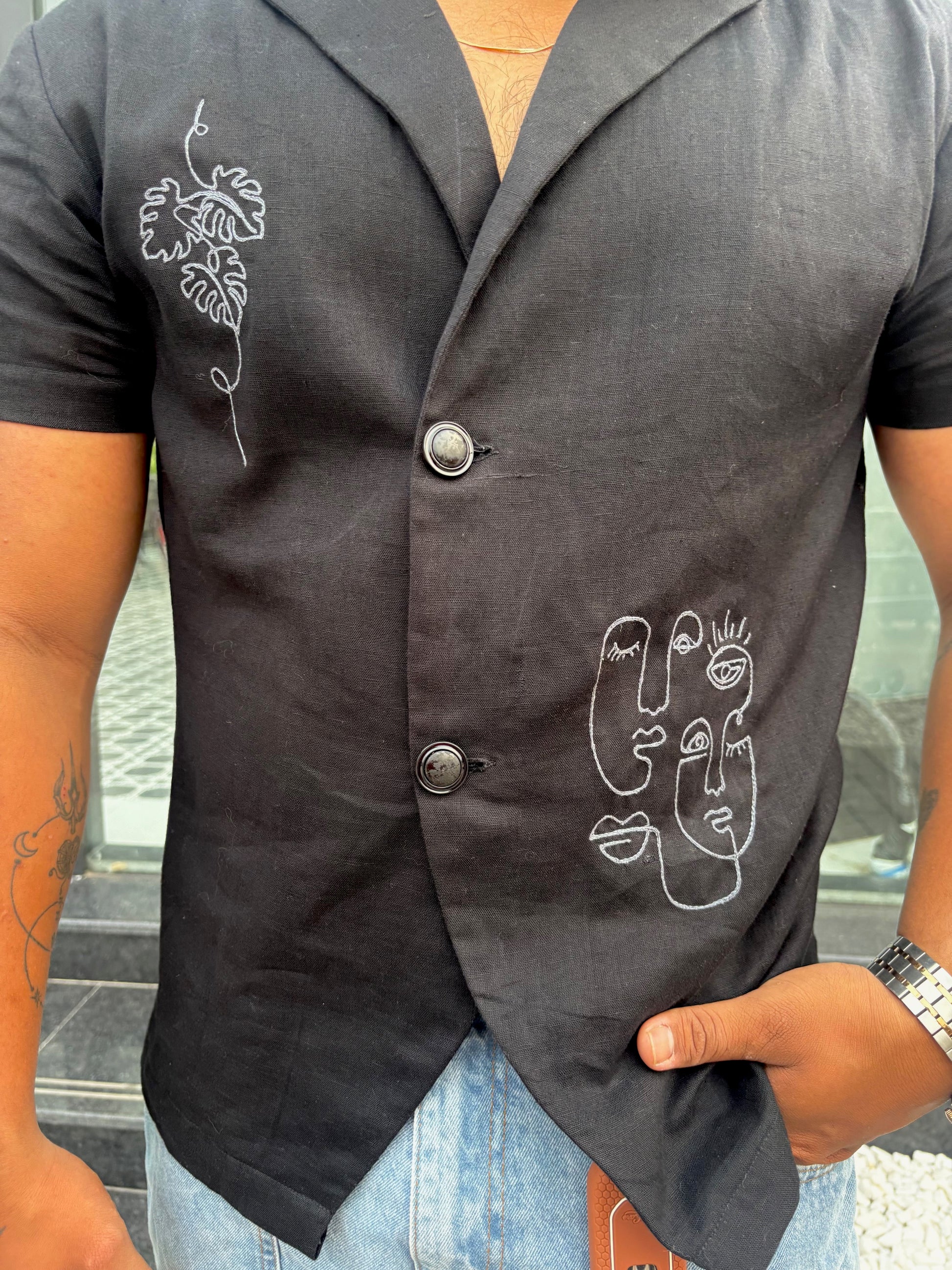 It smelled faintly of late nights and long drives. He wore it with nothing underneath but memory. No agenda. No performance. Just presence. Crafted from breathable pure cotton-linen, this blazer-cut shirt is structured yet easy, with a silhouette that nods to classic chef's jackets. Graphic embroidery on the front adds quiet character, while the two-button closure keeps the design minimal and intentional. Itโs made for understated impact โ worn, not shown off.