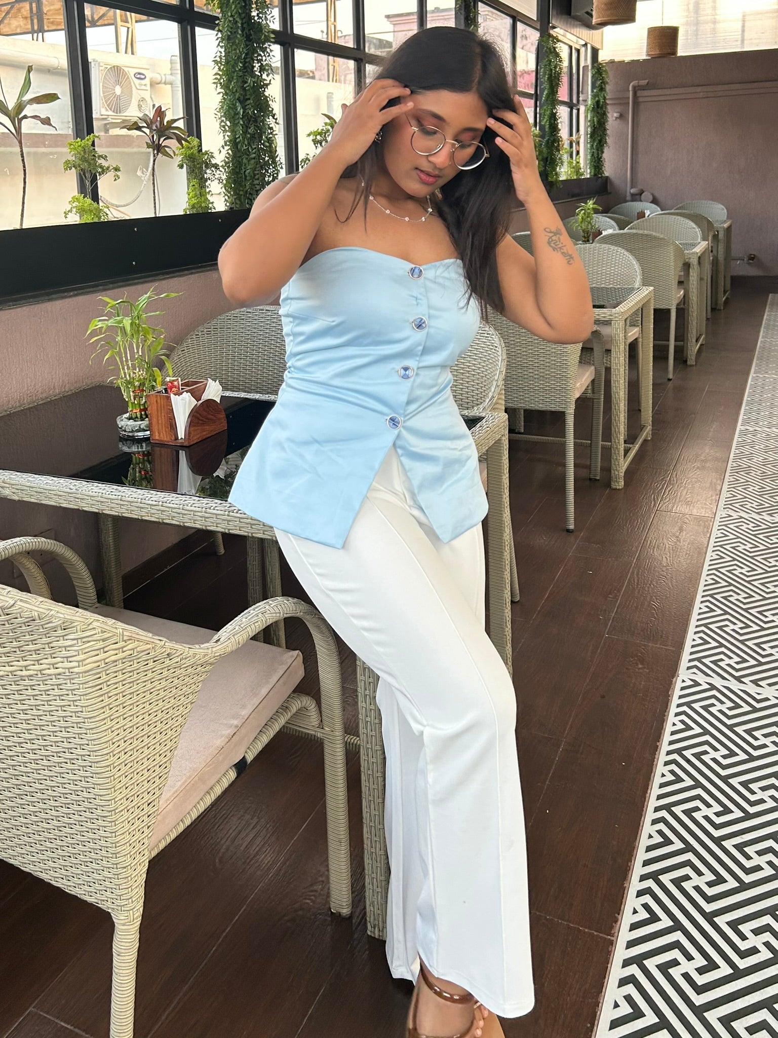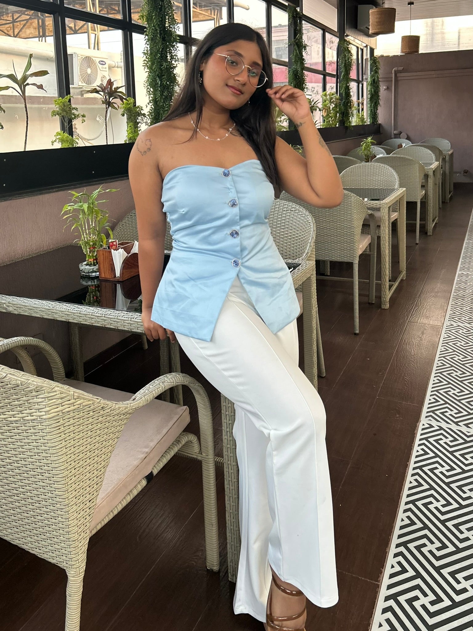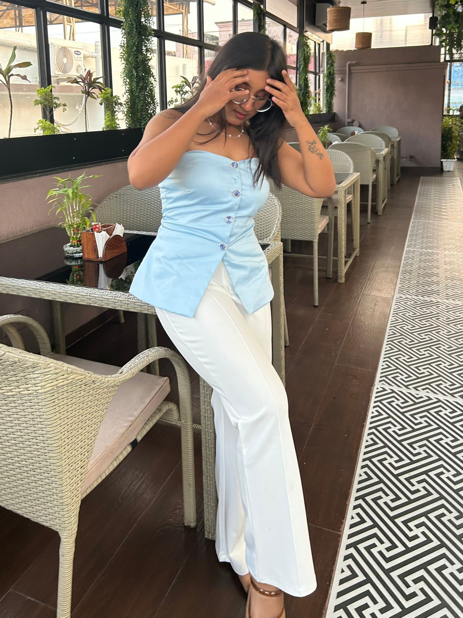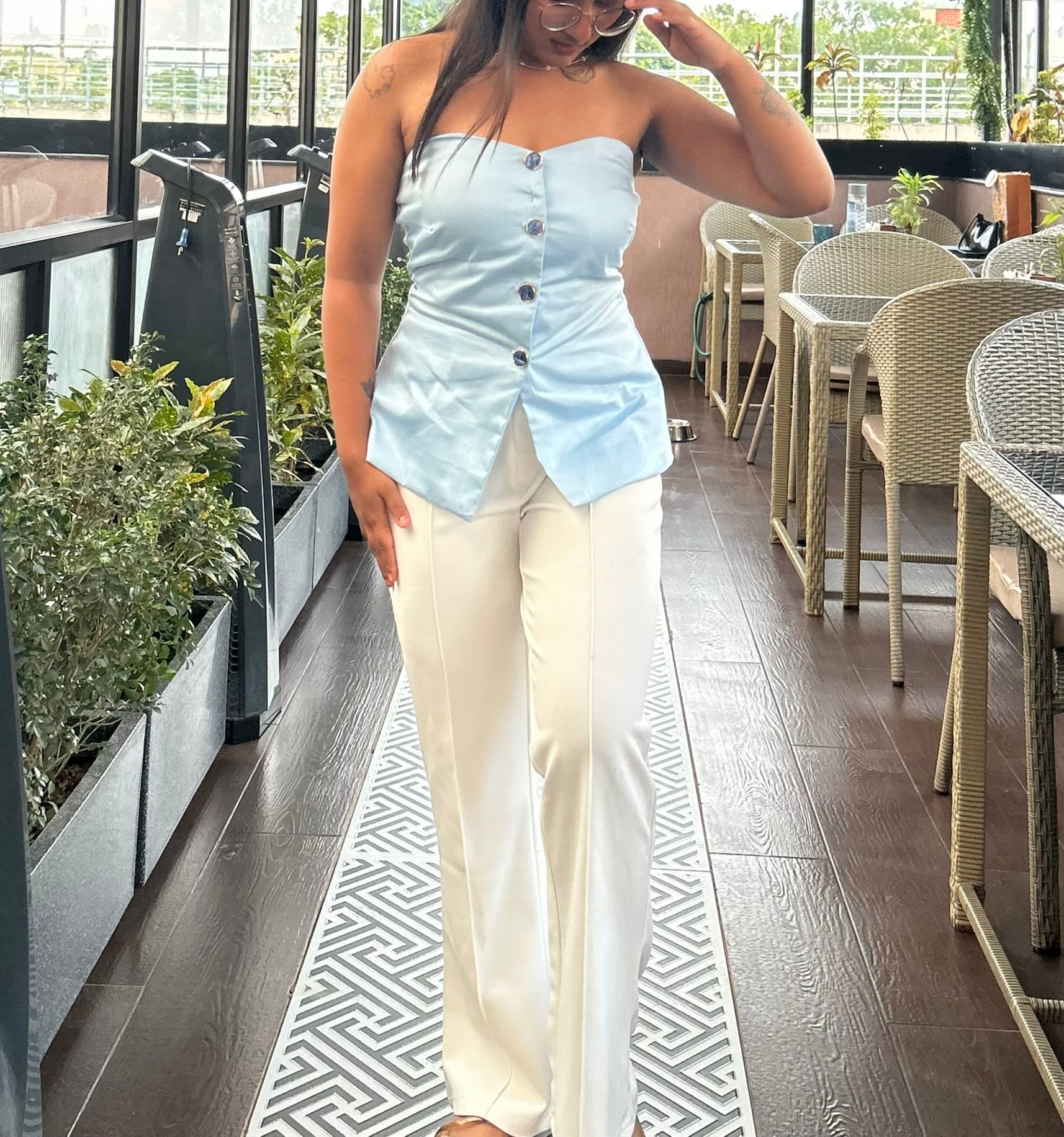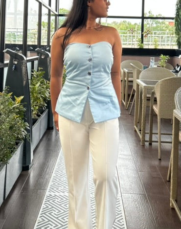 Effortless meets refined in the Zoya Corsette Top. Reversible and buttoned, it offers two ways to wear front or back. The soft powder blue hue lends a quiet elegance, while the corset-style fit creates a sculpted silhouette. Simple, structured, and endlessly versatile.